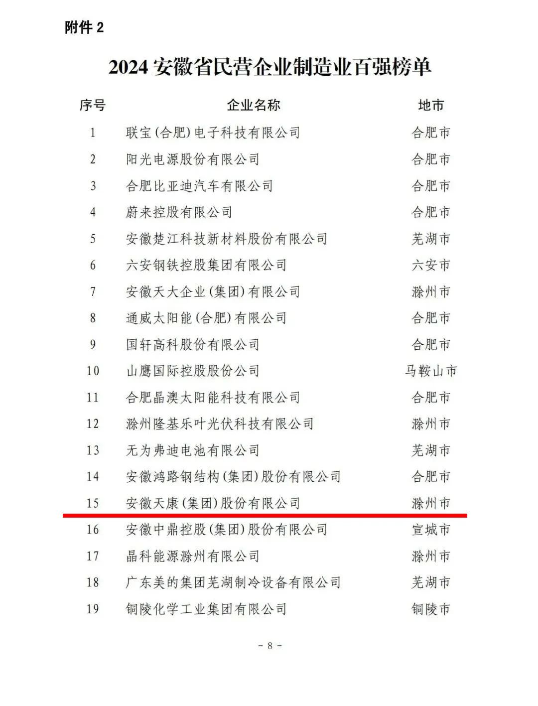 11月29日上午,2024安徽省民营企业百强发布会在合肥举行。安徽省工商联、安徽省工信厅、安徽省市场监管局联合发布2024安徽省民营企业营收百强、制造业百强和服务业百强榜单。安徽天康集团凭借出色的发展成绩荣列营收百强第19位,制造业百强第15位。